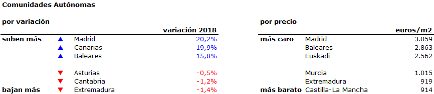 La Comunidad de Madrid es la más cara, con sus 3.059 euros/m2. Le siguen Baleares (2.863 euros/m2), Euskadi (2.562 euros/m2) y Cataluña (2.304 euros/m2). En el lado opuesto de la tabla encontramos a Castilla-La Mancha (914 euros/m2), Extremadura (919 euros/m2) y Murcia (1.015 euros/m2), las comunidades más económicas.