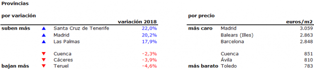 40 provincias han visto crecer sus precios durante 2017. La mayor subida se ha registrado en Santa Cruz de Tenerife (22%), seguido por Madrid (20,2%), Las Palmas (17,9%) y Baleares (15,8%). Con subidas superiores al 10% están también Barcelona (11,9%), La Rioja (11,4%) y Málaga (11,1%). Teruel, en cambio, marca la caída más importante (-4,6%). Le siguen Cáceres (-3,9%) y Cuenca (-2,3%).