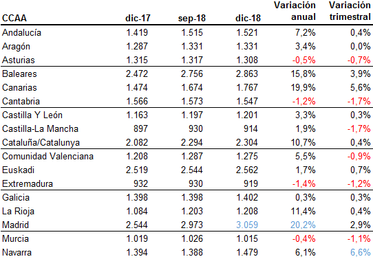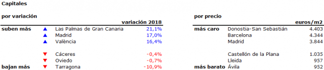 Durante 2018 el precio de la vivienda usada en España ha aumentado, reafirmando el proceso de normalización en el que se instaló hace un año. Los precios crecieron un 8,4% en los últimos 12 meses hasta los 1.720 euros/m2. Las Palmas de Gran Canaria (21,1%) y Madrid (17%) son las capitales de provincia en las que más ha crecido el precio. Tarragona, en cambio, registra la mayor caída (-10,9%).